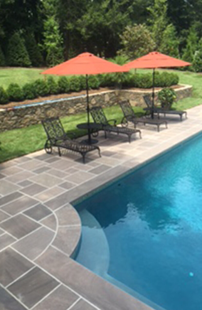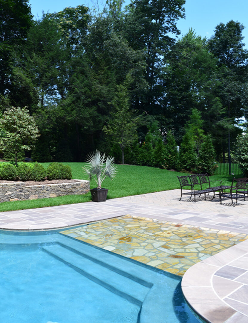 Ashler pattern brownstone was used throughout the patio, creating a clean and polished look. This patio surrounded a beautiful swimming pool that was aligned with brownstone caps along the border.The materials that were used in this landscape exterior created a relaxing and enjoyable space, perfect for the family.