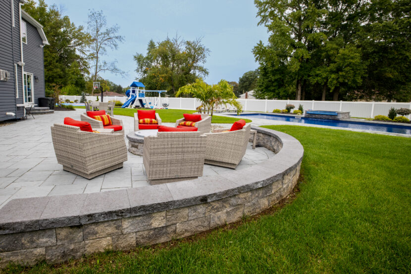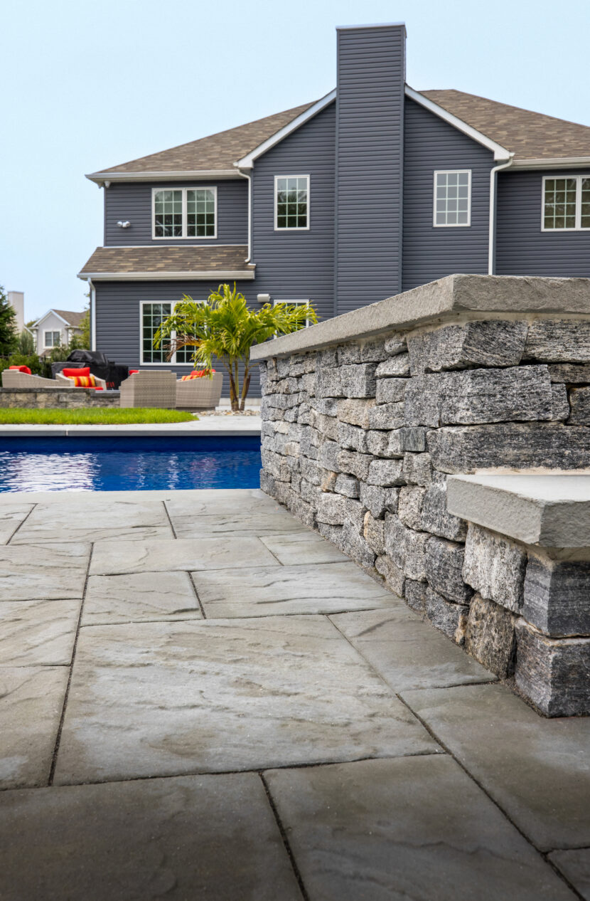 These homeowners opted for Cambridge’s Ledgestone XL Bluestone Blend to complete their dream backyard project. These pavers give the area a sleek look and are rounded off nicely with a matching border that extends the length of the patio and the pool area. The harmonious blend of natural beauty and elegant design creates a tranquil and inviting atmosphere.